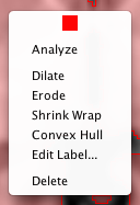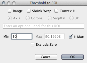 In the viewer window, go to ROI > Threshold to ROI. Select "% Max" and enter a minimum value of 50. After the ROI has been created, right-click inside the ROI and select