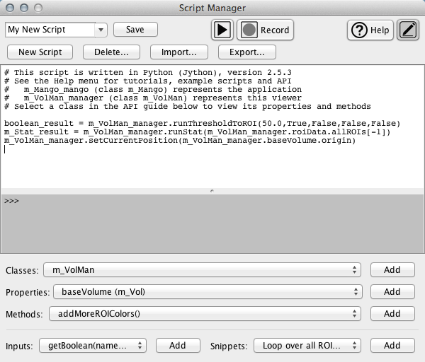 Even if the script syntax looks foreign to you, it should be easy to pick up on the action-sounding words in each of the three lines: "run threshold to roi", "run stat", "set current position". It's easy to see that each of these lines corresponds to one of the actions we recorded earlier.